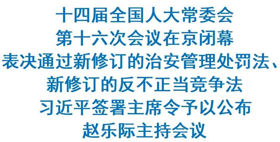 十四届全国人大常委会第十六次会议6月27日上午在北京人民大会堂闭幕。会议经表决,通过了新修订的治安管理处罚法、新修订的反不正当竞争法。国家主席习近平分别签署第49、50号主席令予以公布。赵乐际委员长主持闭幕会。
