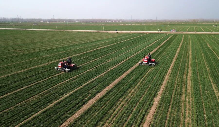山东省汶上县,农民驾驶农机在高标准农田里进行小麦春季管护作业(2024年3月13日摄,无人机照片)。新华社记者 徐速绘 摄