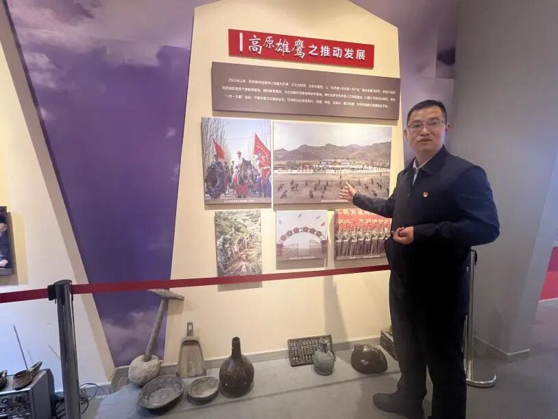 (拜城县人大代表、老虎台乡党委书记邓鑫正在讲述民兵骑兵连的故事。)