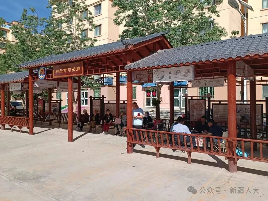 距此不到20公里的哈密市伊州区西河街道惠康园社区居委会门前,一座长24米、宽4米的“和乐传习长廊”同样见证着民生温度。这座由当地居民提议、通过“民生微实事”项目改建的文化空间,原为社区闲置空地,如今廊内装饰着长城、祥云、牡丹等主题彩绘,与居民共拟的廊名交相辉映。建成以来,各族群众在此演绎十二木卡姆传统歌舞,或围坐畅谈休憩,使长廊兼具文化传承、休闲娱乐、邻里交往等多重功能。